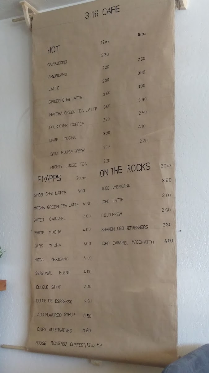 Overall, 3:16 Cafe’s menu is designed to cater to diverse tastes, offering a combination of hot and cold drinks, sweet pastries, savory meals, and seasonal specials that are perfect for any time of day. Whether you're in the mood for a pick-me-up or a relaxing treat, this cafe has something for everyone.